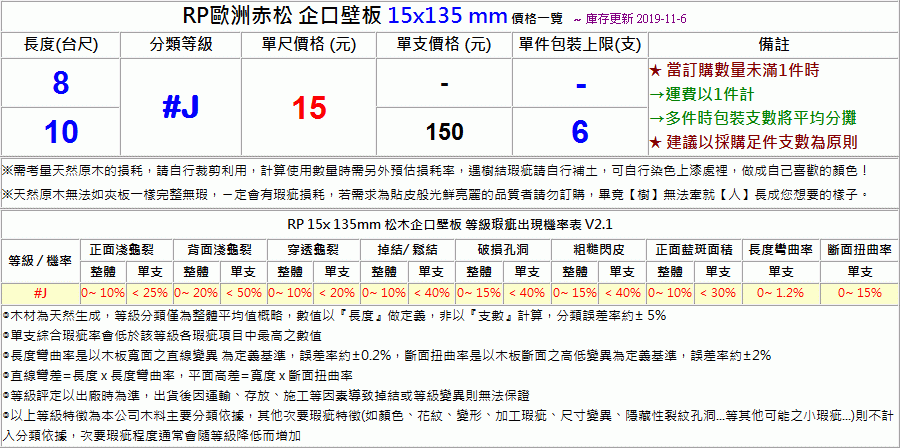 RP 15x 135mm 松木企口壁板 等級瑕疵出現機率表 V2.1 |