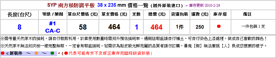 SYP 南方松防腐平板 38 x 235 mm 價格一覽 (國外原裝進口) ~ 庫存更新 2016-2-24 |